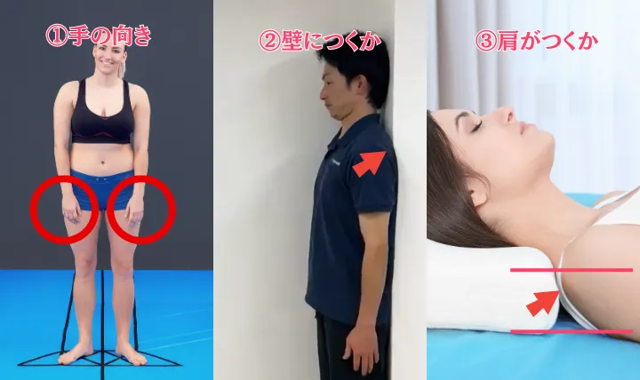 - 壁立ちチェック: 壁にかかと、お尻、背中(肩甲骨)をつけて立ちます。この時、意識しなくても自然に肩の後ろ(肩峰部分)が壁につきますか? 巻き肩の場合、肩が壁から離れやすくなります。