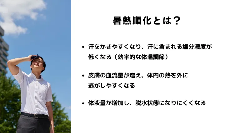 「暑熱順化」とは、体が暑い環境に適応していくプロセスを指します。暑い日が続くことで、私たちの体は徐々に変化し、