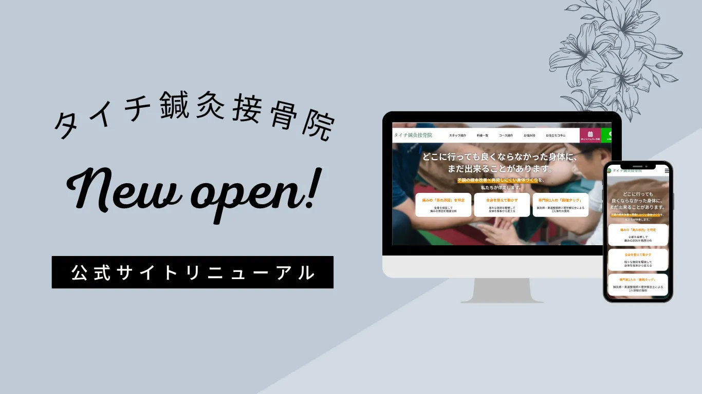 2025年11月よりタイチ鍼灸接骨院の公式ホームページをリニューアルしました。新しくなったホームページをご確認ください。お手数をおかけしますがよろしくお願いいたします。